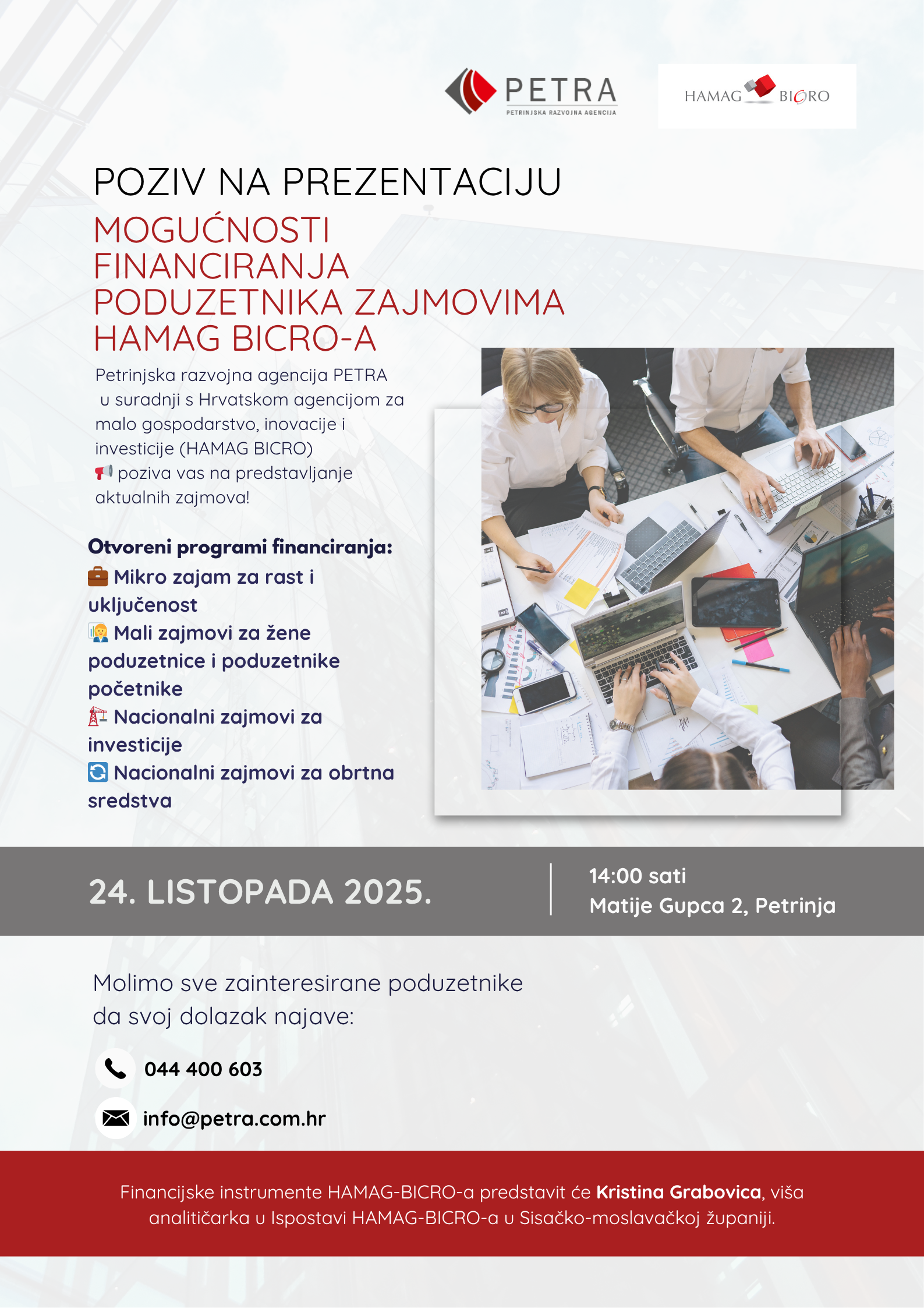 Petrinjska razvojna agencija PETRA poziva sve poduzetnike, obrtnike i one koji to žele postati na predstavljanje: „Mogućnosti financiranja poduzetnika zajmovima Hrvatske agencije za malo gospodarstvo, inovacije i investicije (HAMAG BICRO)”.